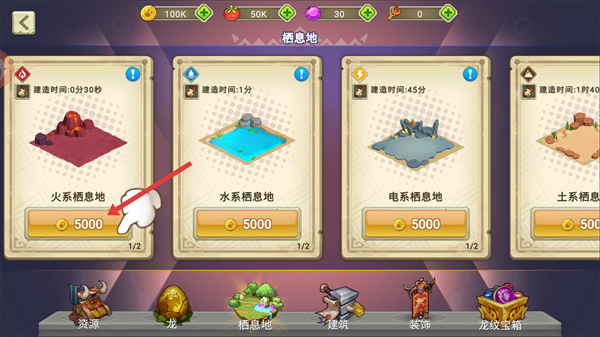2、可選擇不同系的棲息地,如火系棲息地,花費金幣建造,不同棲息地建造時間不同,滿足巨龍居住需求。