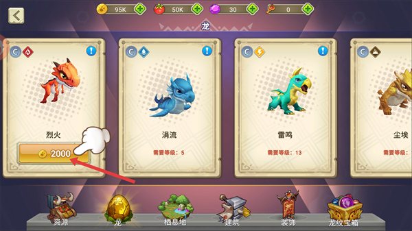 3、可獲取不同種類的龍,如烈火龍,花費金幣解鎖,還有其他系的龍需達到對應等級才能解鎖。