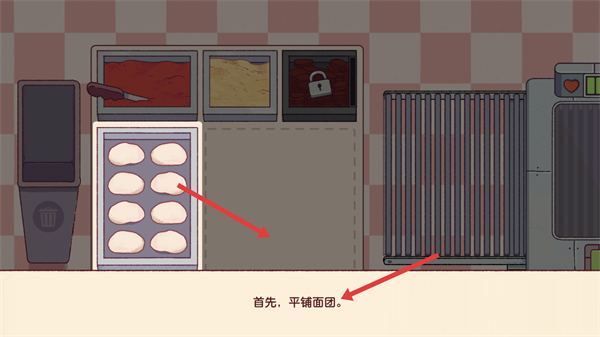 1、披薩制作流程:點擊“新游戲”開啟旅程,將面團拖至桌面手工搟圓,涂抹番茄醬、撒上芝士,按顧客要求添加辣腸、蘑菇等配料,放入烤爐烘烤。