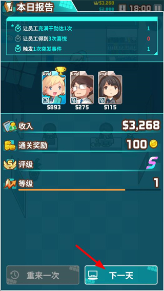 1、在本日報告界面查看當日任務完成情況和收入、評級等信息,點擊下一天按鈕,開啟新一天的公司經營流程。