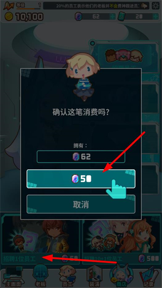 3、彈出確認這筆消費嗎的彈窗時,選擇消耗對應的資源完成操作,同時可通過招聘功能獲取新員工擴充團隊。