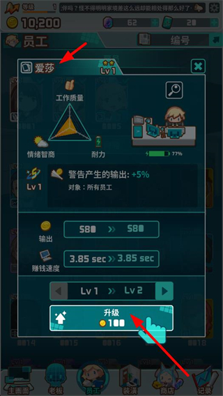 2、進入員工界面查看員工信息,如愛莎的工作質量、屬性等,點擊升級按鈕,提升員工等級以增強其工作產出。