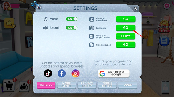 2、然后點擊language選項切換不同的語言,也可以打開或者關閉背景音樂。