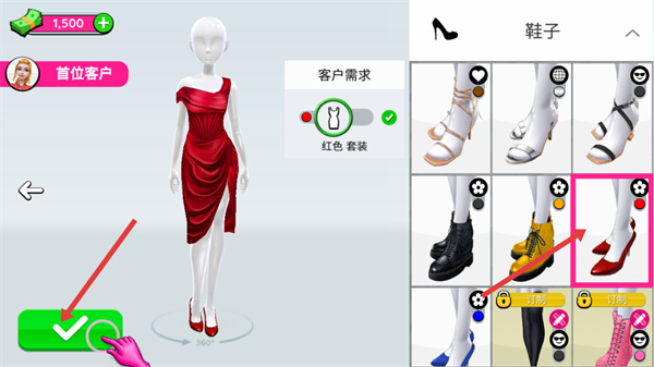 3、根據客戶需求,從服裝列表里選擇合適的服飾,像紅色套裝、紅色鞋子等,搭配好后點擊確認。