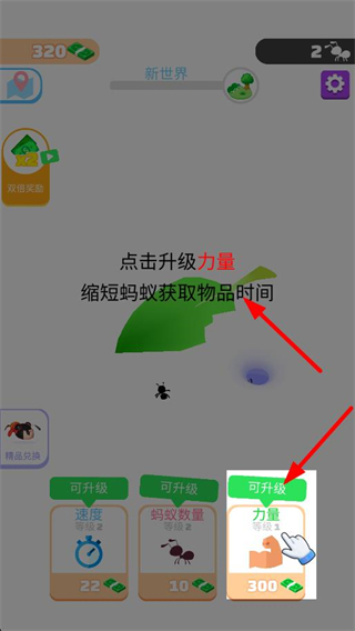1、升級力量屬性,消耗對應資源點擊力量選項,升級后能縮短螞蟻獲取物品的時間,提升搬運的效率。