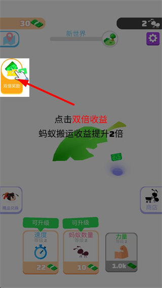 2、接著點擊雙倍獎勵按鈕,觸發后螞蟻搬運的收益會提升2倍,能更快積累資源,助力后續的屬性升級與玩法推進。