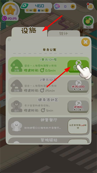4、在設施界面升級單身公寓等房產設施,縮短修建時間,提升房產的吸引力和收益能力,推進租房經營的發展進程。