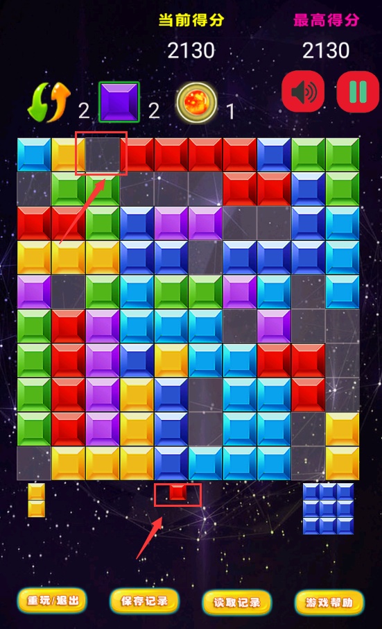 3、當某行或某列被方塊完整填滿時,將觸發消除特效并獲得積分獎勵。