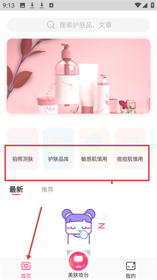 1、首頁,有拍照測膚、護膚品庫等功能入口,還有最新板塊,整體以粉色為主,布局清晰,方便用戶查找護膚相關服務。