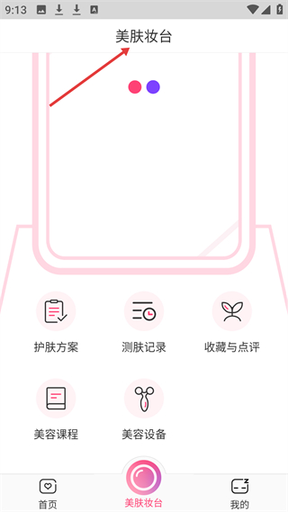 2、美膚妝臺界面,有護膚方案、測膚記錄等功能,粉色元素突出,可幫助用戶管理護膚流程和記錄肌膚狀態。