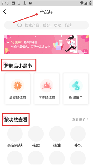 3、產品庫界面,有護膚品小黑書和按功效查看板塊,能查詢敏感肌、痘痘肌慎用產品及美白、祛痘等功效護膚品,助力用戶選品。