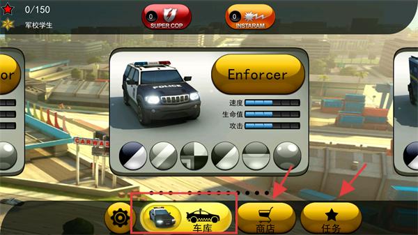 3、點擊RAM按鈕可以粉碎前方的車輛,點擊super cop可使你的跑車速度更快,追捕并拿下亡命飆車手。