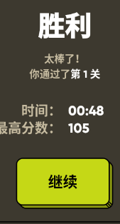 4、通關第2關后出現勝利界面,查看通關時間與分數,點擊繼續按鈕,進入下一個關卡繼續進行消除挑戰。