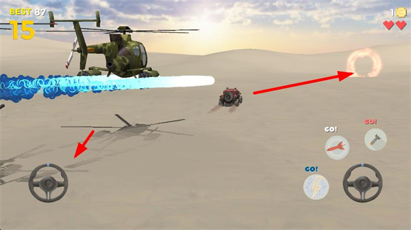 1、通過操控方向盤控制載具移動,追擊目標載具,同時避開障礙物,積累得分推進游戲。
