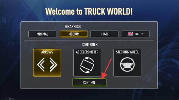 1、首次進入游戲可以選擇你喜歡的操作方式,游戲內共有三種操作方式,分別是按鈕模式、重力感應模式以及方向盤模式,選擇好后點擊CONTINUE即可進入游戲。