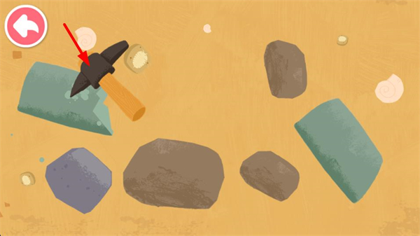 3、切換到挖掘場景后,操控錘子工具,點擊目標石塊,使用錘子敲擊石塊,觸發石塊的破碎互動,推進挖掘進程。