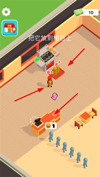 2、餐品擺放好后,將柜臺處的漢堡交付給排隊的顧客,完成訂單交易,獲取對應的收益,推進店鋪經營。