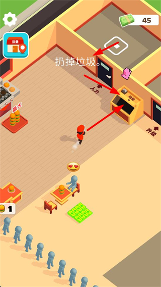 3、按提示操作角色前往垃圾處,將垃圾丟棄到垃圾桶里,保持店鋪內的環境整潔,保障店鋪正常運營。