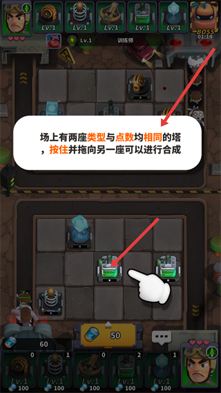 2、場上兩座類型與點數相同的塔可合成,按住并拖向另一座塔,合成更高等級的塔,提升防御能力。
