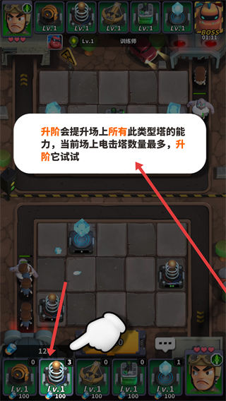 3、可對塔進行升階,提升場上所有同類型塔的能力,選擇數量最多的塔升階,強化整體防御。