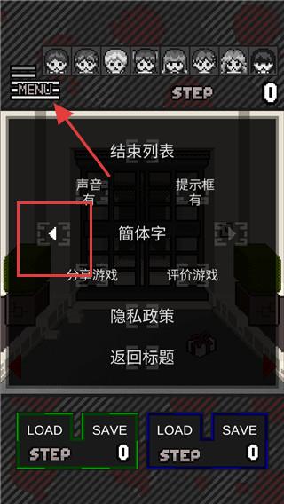 1、玩家可在菜單界面設置聲音、提示框顯示選擇語言簡體字,還能進行分享評價游戲等操作,也可管理存檔LOADSAVE方便繼續游戲。