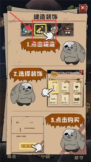 2、玩家可通過建造裝飾功能,按點擊建造選擇裝飾點擊購買的步驟,在小鎮中建造和布置各類設施,提升小鎮的生存條件和防御能力。