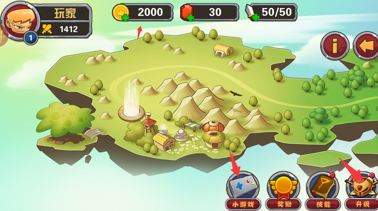 1、主界面清晰展示當前持有金幣數量,并提供裝備強化選項,可隨時提升戰斗屬性。