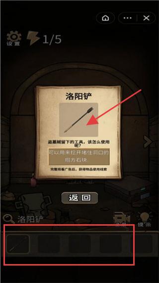 1、游戲中玩家會獲得各種道具如洛陽鏟,通過閱讀道具說明可用來挖開堵住洞口的地方石塊,在合適場景使用道具解開謎題推進游戲。