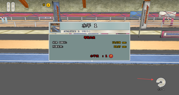 3、訓練結束后界面顯示成績信息,玩家按箭頭指示點擊對應按鈕,可進行下一輪訓練或操作。