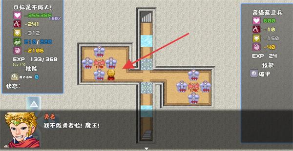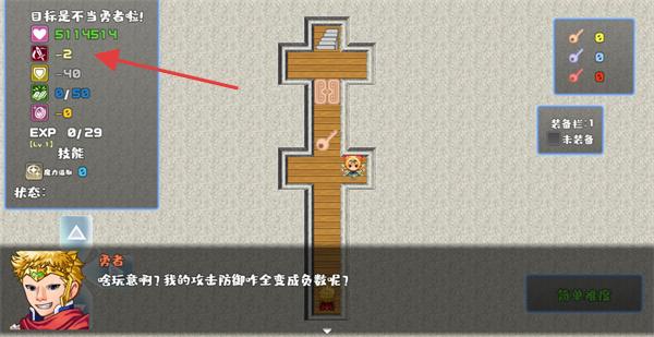 1、玩家操控勇者角色,屏幕左側顯示角色屬性、攻擊防御等數值,通過戰斗獲得經驗值升級,提升屬性和解鎖技能,增強角色實力。