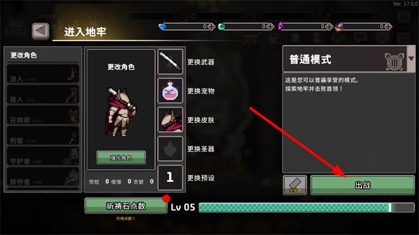 1、進入地牢前可更改角色、武器、寵物等,選擇普通模式后點擊出戰,即可進入地牢開始冒險探索。
