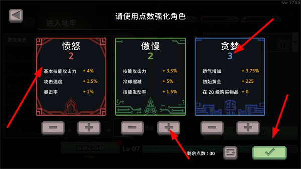 4、用點數強化角色的憤怒、傲慢、貪婪等屬性,調整屬性后點擊對勾確認,提升角色的各項能力。