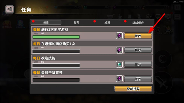 2、在任務界面可查看每日、每周等任務,完成任務后點擊接收,獲取獎勵助力地牢冒險。