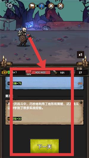 3、事件驅動玩法:通過點擊“下一天”推進關卡,每日觸發不同事件,獎勵屬性加成與經驗,增加冒險敘事感。
