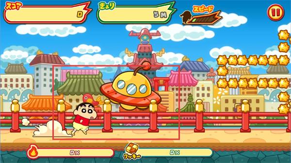 1、基礎跑酷操作:滑動屏幕控制小新跳躍躲避障礙物,收集餅干糖果等道具,注意側方障礙可通過對接攻擊消除。