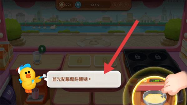 1、玩家進入游戲廚房場景,根據提示【首先點擊松餅面糊】,點擊操作區域制作松餅面糊。