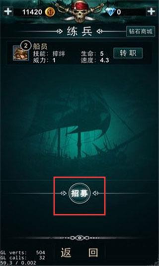1、在練兵界面玩家可看到船員相關信息如技能生命威力速度,點擊招募按鈕,消耗資源招募船員,擴充隊伍實力。