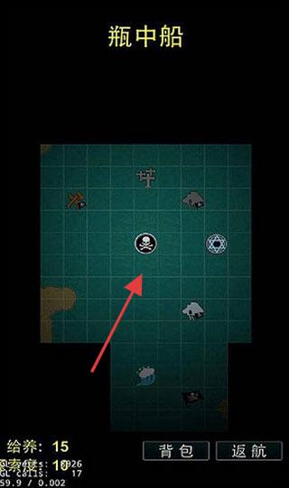2、在瓶中船場景玩家操控船只在方格地圖上移動探索按箭頭指示,過程中可能遭遇各種事件和敵人,同時要關注給養等資源數值,確保航行順利。