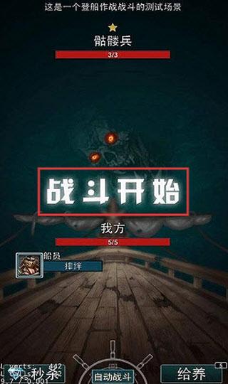 3、遇到敵人如骷髏兵進入戰斗場景,玩家可選擇自動戰斗或手動操作,利用船員技能和屬性與敵人戰斗,擊敗敵人獲取獎勵,推動游戲進程。