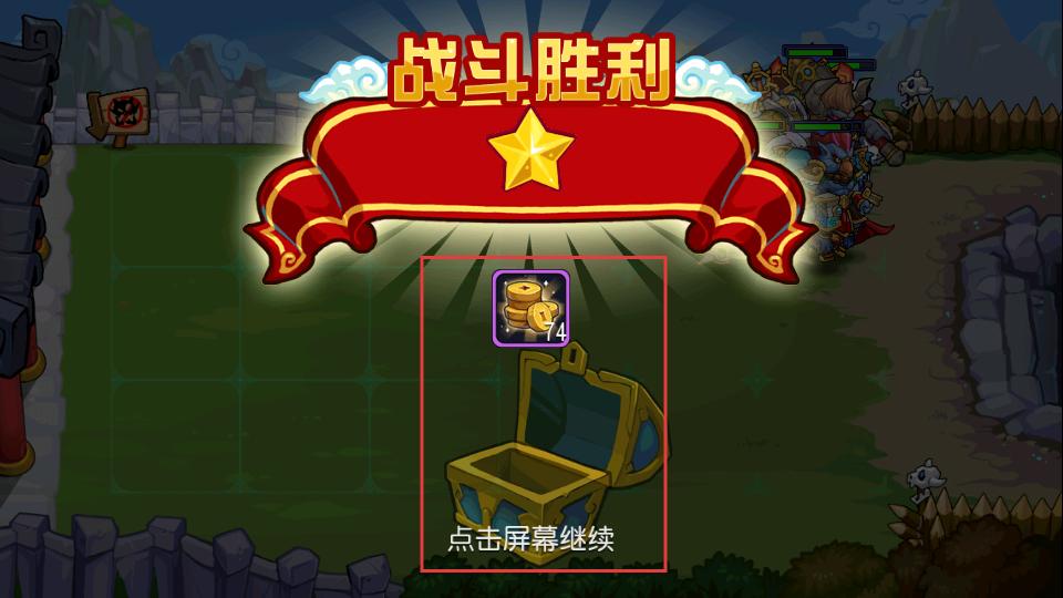3、成功擊敗所有敵人后,戰斗勝利,會獲得金幣等獎勵,點擊屏幕可繼續游戲,去挑戰更多關卡。