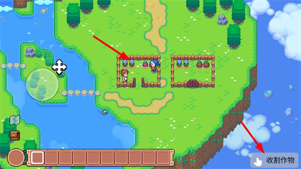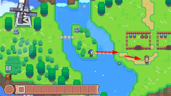 1、操控角色移動,通過橋梁前往不同區域,可探索場景內的農田、水域等區域,開啟田園經營的流程。
