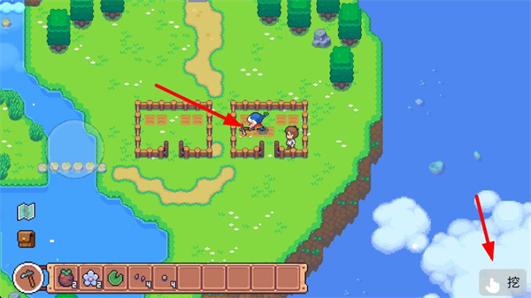 4、使用工具進行挖掘操作,點擊挖按鈕,可獲取土壤等物資,用于后續的農田種植或場景布置,推進田園建設。