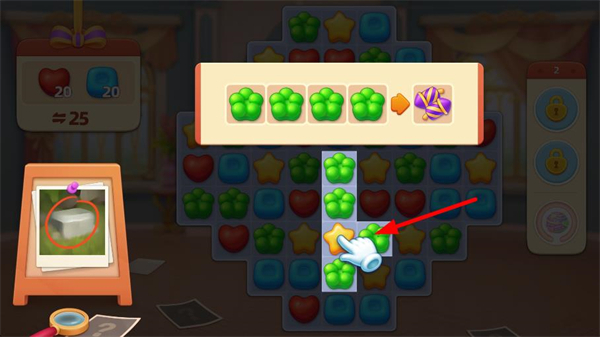 1、在消除界面找到相同樣式的元素,點擊對應位置完成合成,合成指定數量的元素后可獲得新道具,推進消除進程。