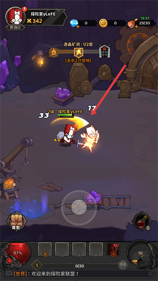 1、在湯晶礦洞等場景攻擊怪物,通過戰斗提升等級,同時可查看背包,準備應對各種冒險挑戰。