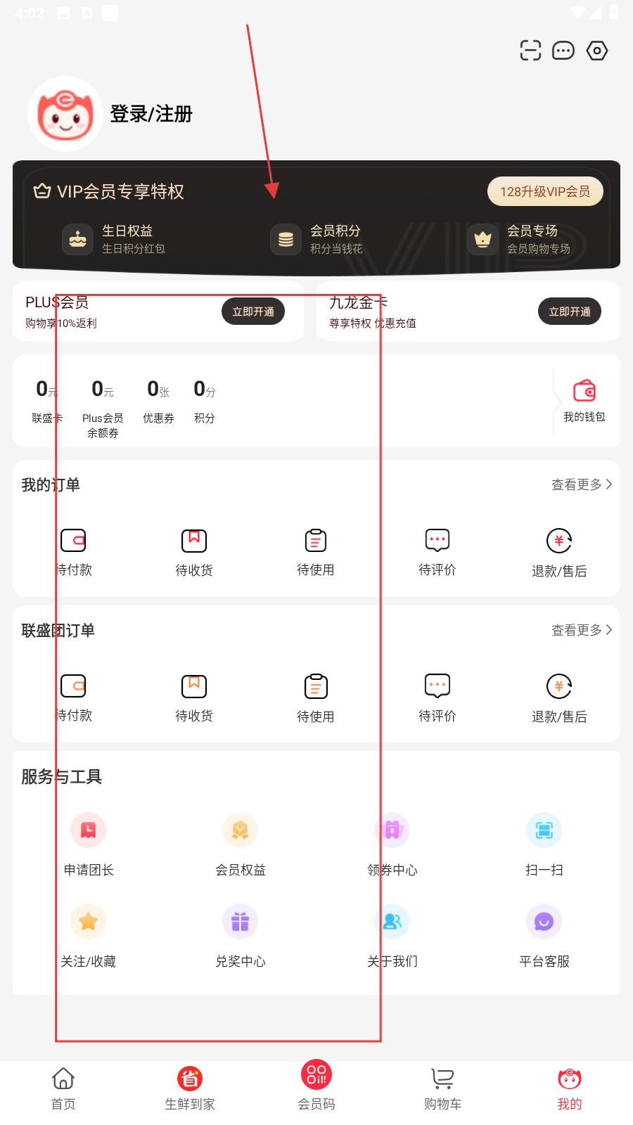 1、首先可進入我的界面,可查看VIP會員特權,管理訂單及聯盛團訂單,使用申請團長、領券中心等服務工具,助力用戶高效管理購物賬號與權益。