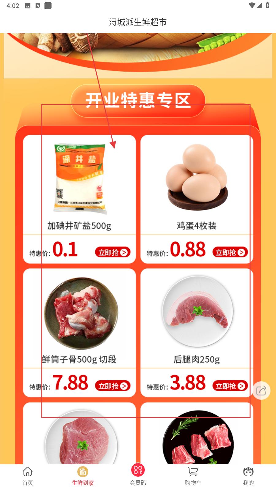 2、還可在生鮮到家界面,可查看開業特惠商品,如加碘井礦鹽、雞蛋、鮮筒子骨等,價格實惠,點擊立即搶即可購買,方便用戶選購生鮮食材。