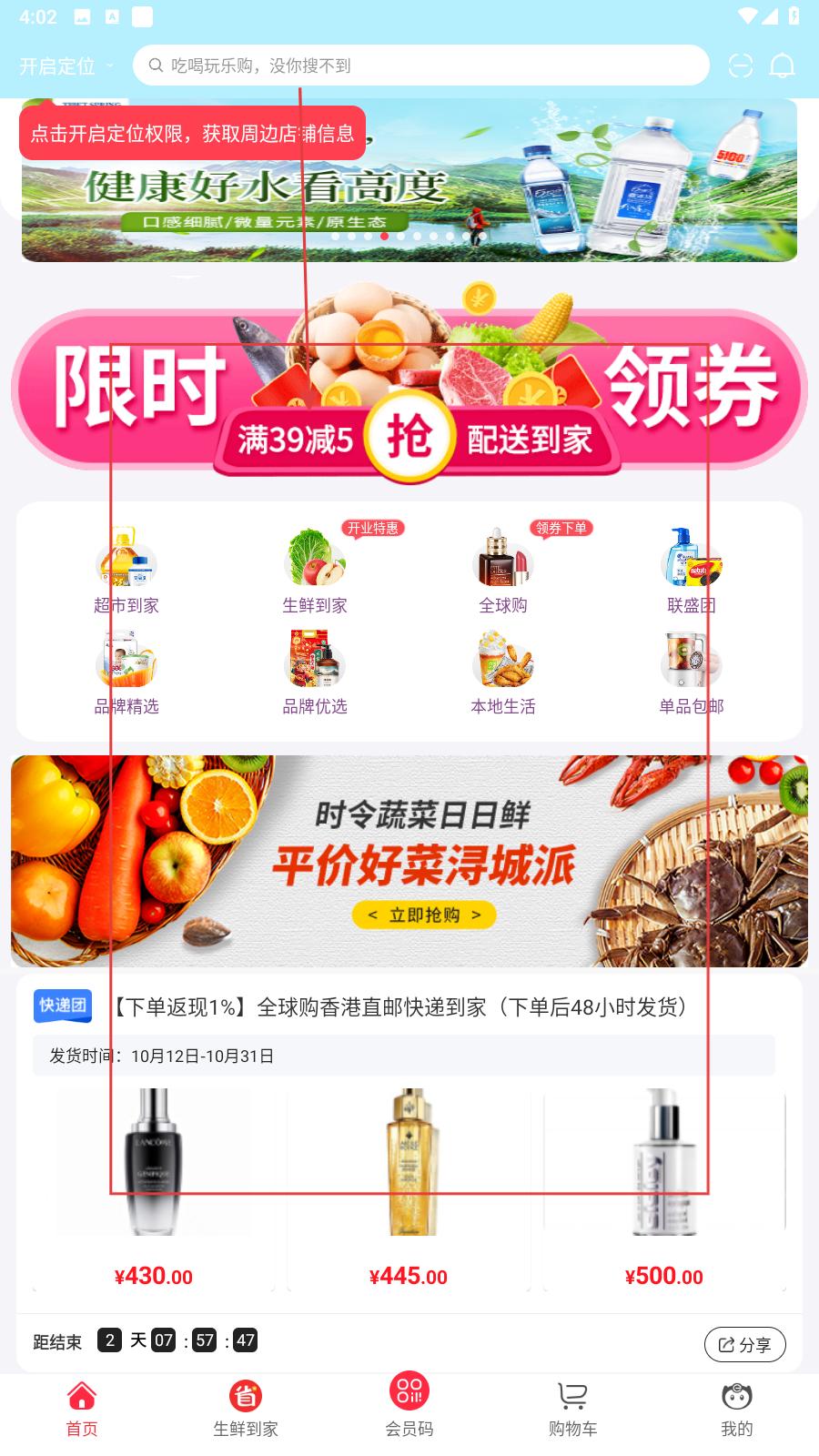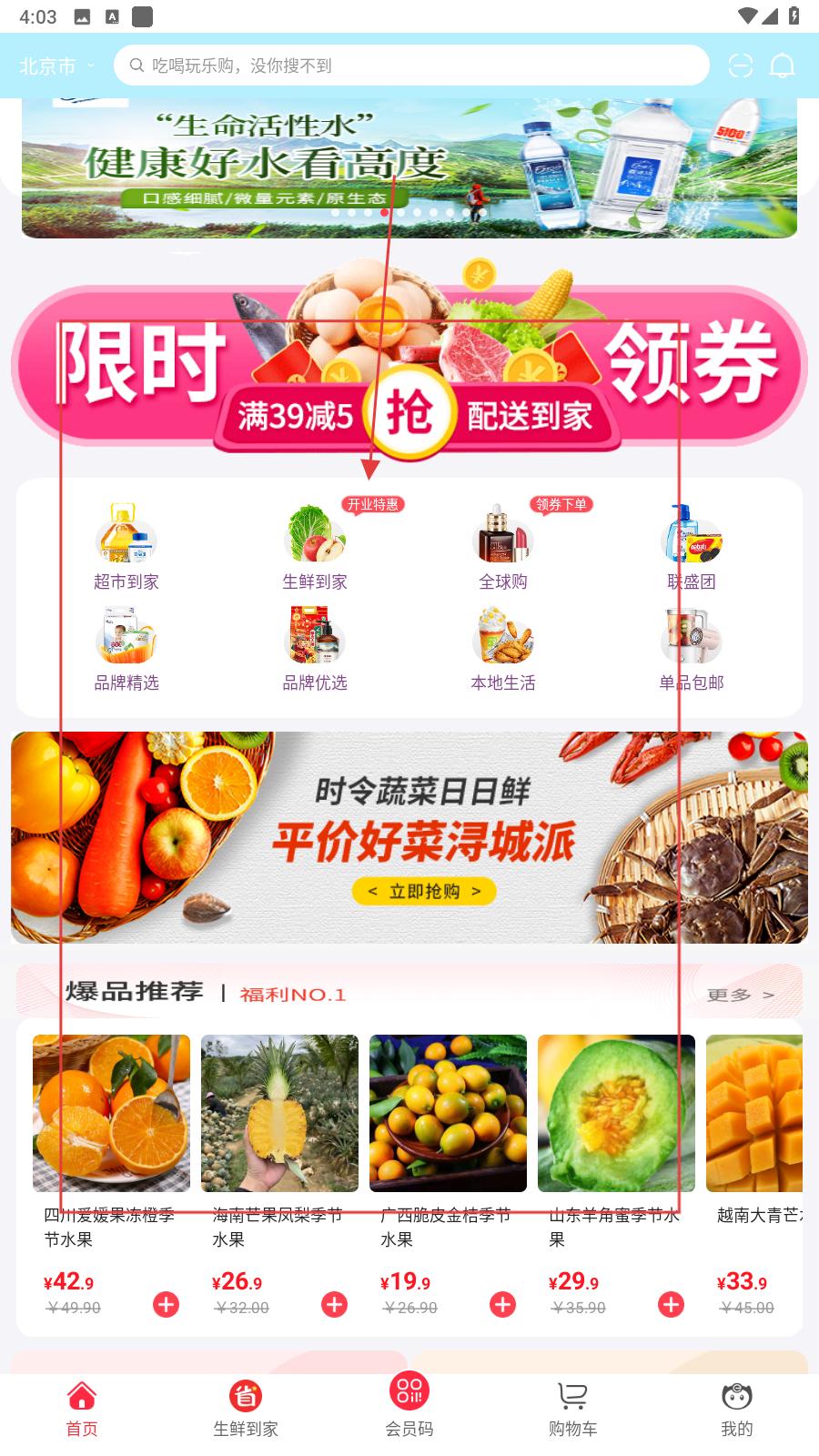 3、在首頁有時令蔬菜、爆品水果推薦,還有超市到家、生鮮到家等功能入口,可參與限時領券活動,滿39減5且配送到家,助力用戶便捷選購各類商品。