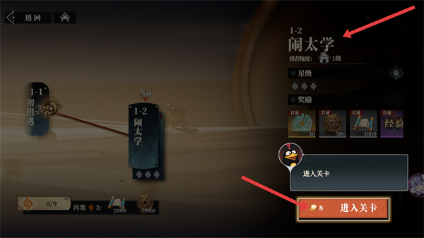 4、在關卡界面選擇如鬧太學等關卡,點擊進入關卡,開啟新的戰斗挑戰,獲取關卡獎勵。