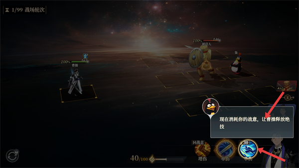 2、戰斗的過程消耗戰魂釋放絕技,如曹操的絕技,對敵人造成傷害,提升戰斗效果。