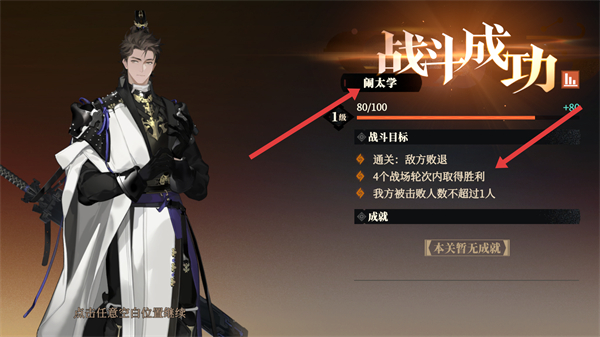 1、戰斗成功后可查看關卡如鬧太學的進度、戰斗目標完成情況,點擊任意空白位置繼續游戲,獲取關卡獎勵和經驗。